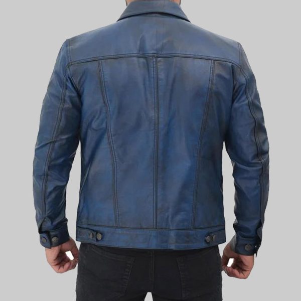 Elevate your style with our Men Blue Trucker Leather Jacket. Crafted from premium genuine leather, its bold blue hue and classic trucker design make a statement. The jacket’s functionality meets fashion with practical pockets, offering a versatile and stylish wardrobe essential. Suitable for all seasons, its simple maintenance ensures lasting appeal. Embrace timeless style with this distinctive Men Blue Trucker Leather Jacket.