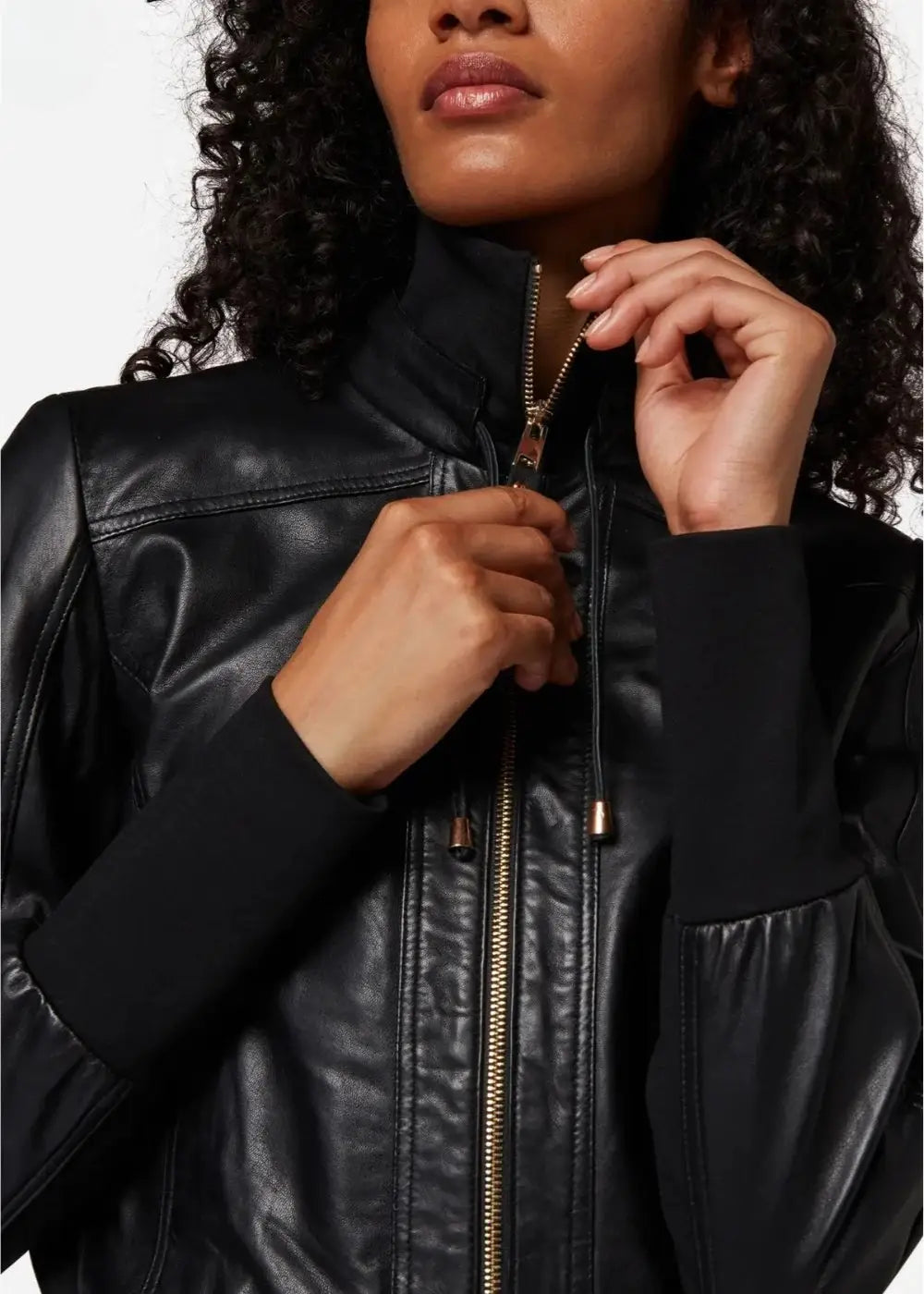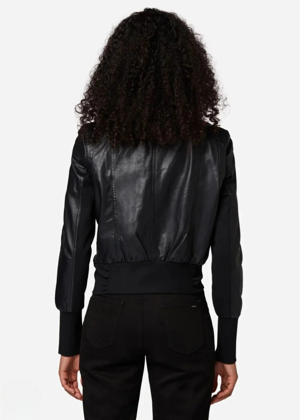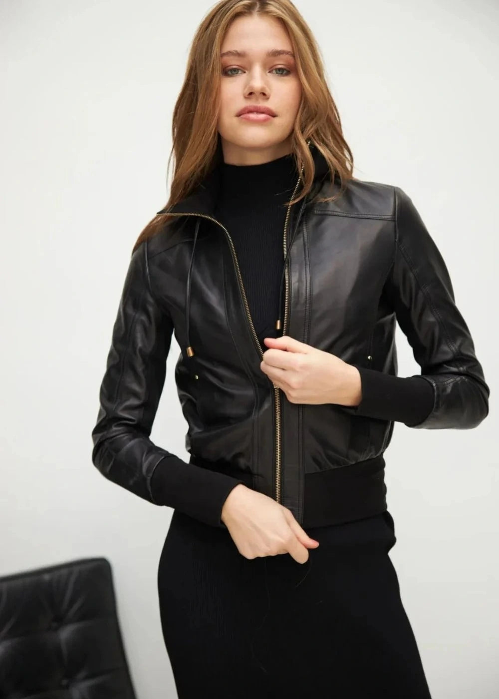 The Elara delivers understated elegance with its sleek black leather and classic bomber silhouette. Made from real sheepskin leather, it offers a smooth finish and lasting comfort. The straight knitted collar and ribbed trims add a refined, structured touch, making it a versatile essential for everyday wear.