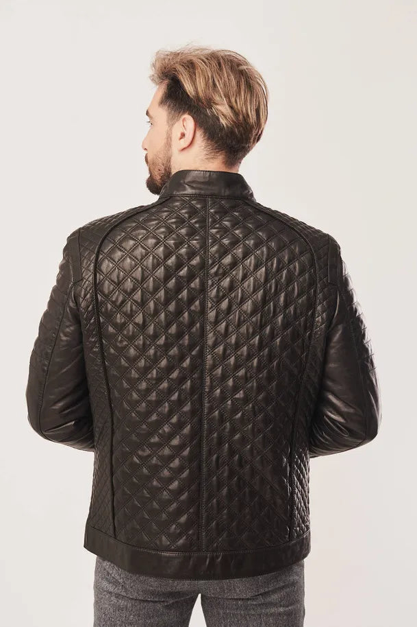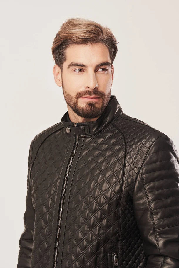 Crafted from premium sheepskin leather, this men's jacket combines timeless style with modern comfort. The distinctive diamond quilted finish adds visual interest and texture, while the regular fit silhouette flatters a range of builds. A front zipper closure ensures easy on-and-off wear, and practical pockets two at the waist plus one interior keep essentials within reach. The polyester lining provides smooth comfort against the skin. Perfect for layering through cooler months or wearing as a standalone statement piece, this black leather jacket transitions effortlessly from casual to smart-casual occasions.