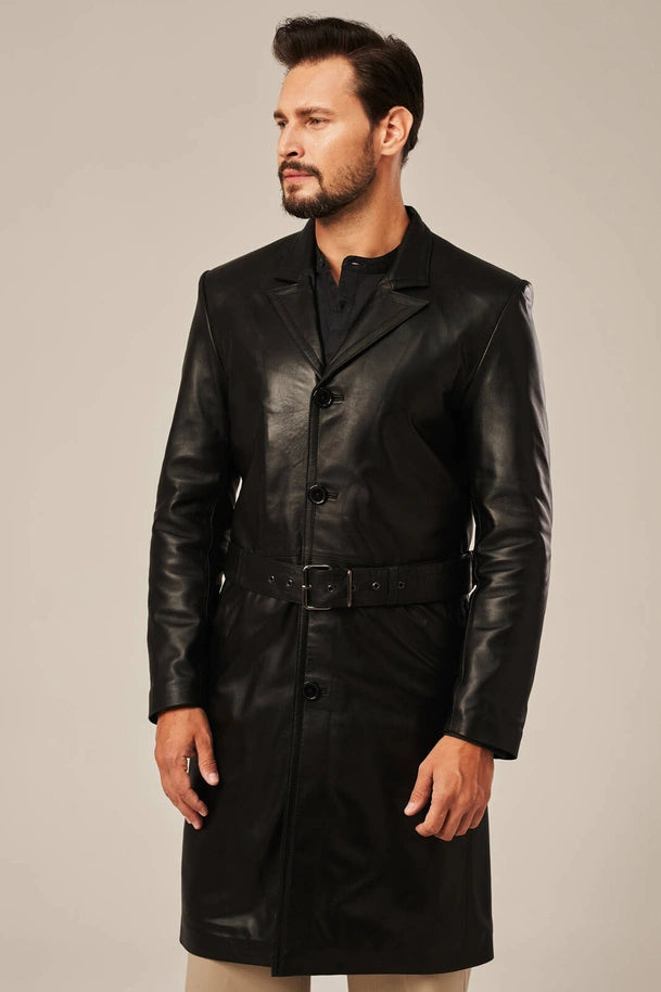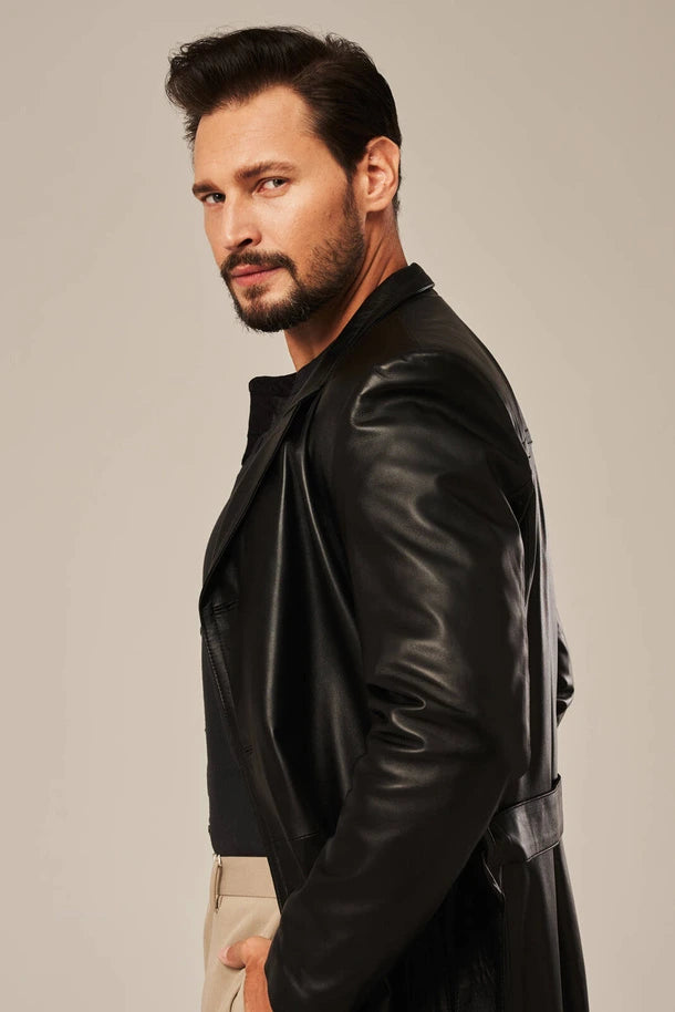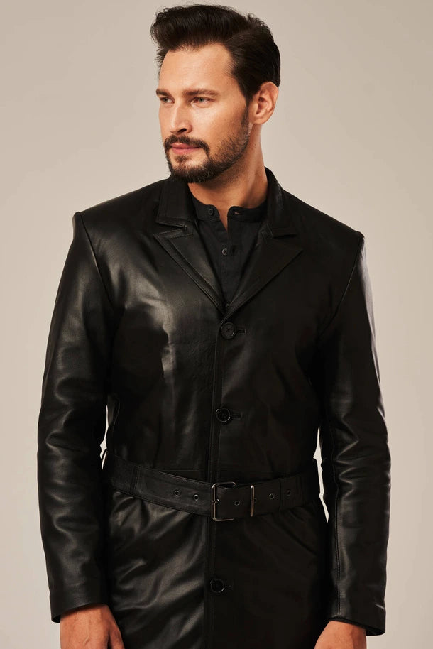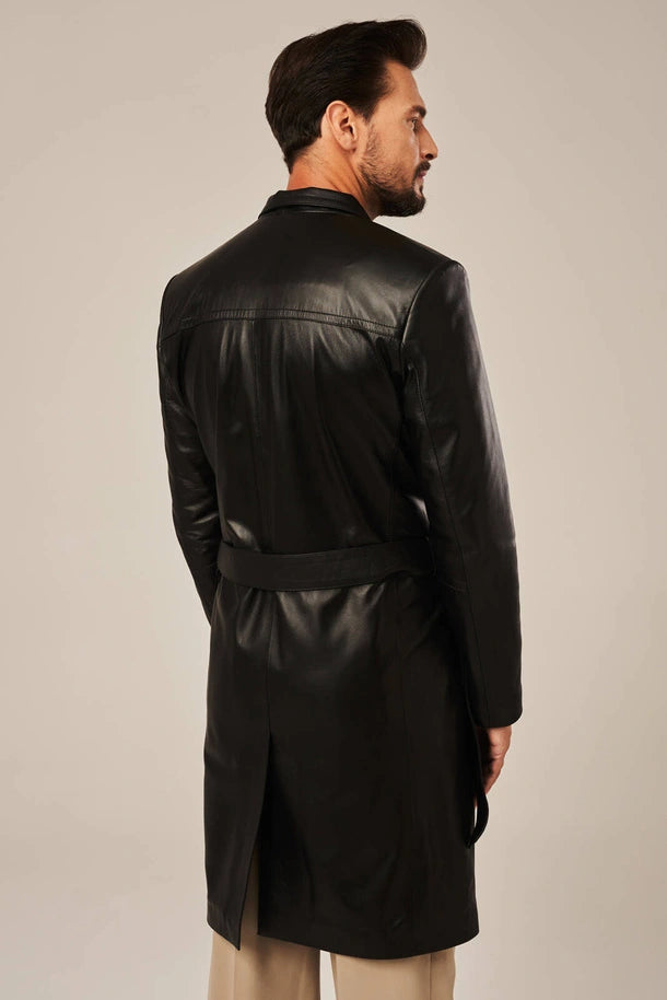 Experience refined warmth with the Ravik men's black sheepskin leather coat. Constructed from premium sheepskin leather with a soft polyester lining, this coat combines durability with comfort. The regular fit, coat-length design features a clean finish enhanced by a belted waist for a polished silhouette. Button closure and two inner pockets provide practicality, while the classic black color ensures versatility across any winter wardrobe. An investment piece built to last.